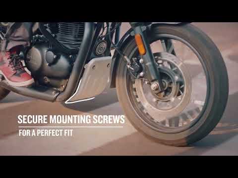 Sump Guard consists of a pressed heavy duty aluminium alloy plate with centered Royal Enfield branding. Mounting brackets incorporate rubber isolation to dampen vibrations and enable quick removal using standard tools for cleaning.